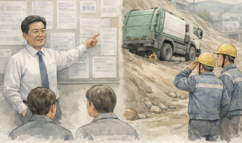 경사도가 약 35도나 되는 가파른 도로에서 정화조 청소 작업을 하던 중이었습니다.